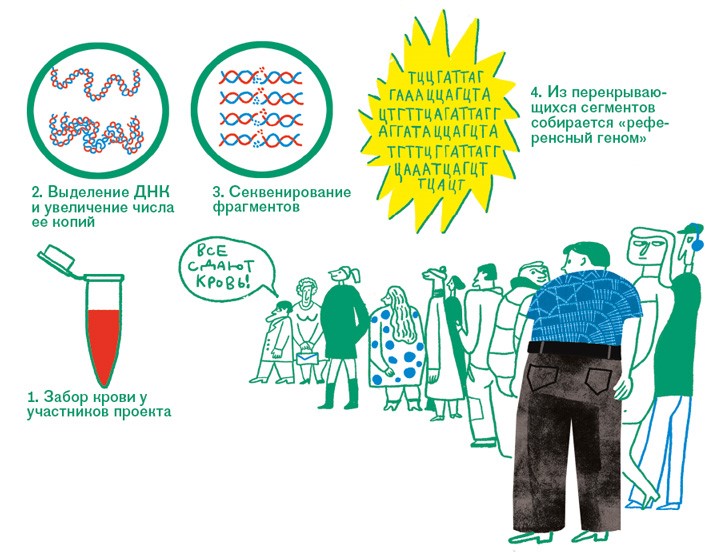 Наверняка ты задаешься вопросом: кто тот счастливчик, геном которого изучают? Таких людей несколько. У каждого, кто принял участие в исследовании, сначала взяли кровь. Потом выделили из нее лейкоциты (это такие клетки крови, они важны для иммунитета), а из них – ДНК. Затем ДНК от нескольких людей смешали и в итоге узнали усредненную последовательность. Ее назвали референсным геномом. Он стал образцом, «золотым стандартом», с которым можно сравнивать геномы других людей. Это не значит, что он идеальный. Просто ученые договорились принять эту последовательность за точку отсчета.