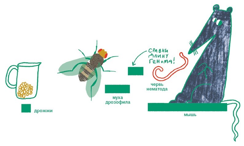 Кстати, название «Геном человека» не совсем точное. За время действия проекта ученые расшифровали последовательности геномов и других живых существ: мыши, дрожжей, мухи дрозофилы, небольшого червяка нематоды. Их геномы меньше человеческого, поэтому исследователи тренировались на них, чтобы проверить свои возможности и взвесить шансы: получится прочитать геном человека или нет? И получилось!