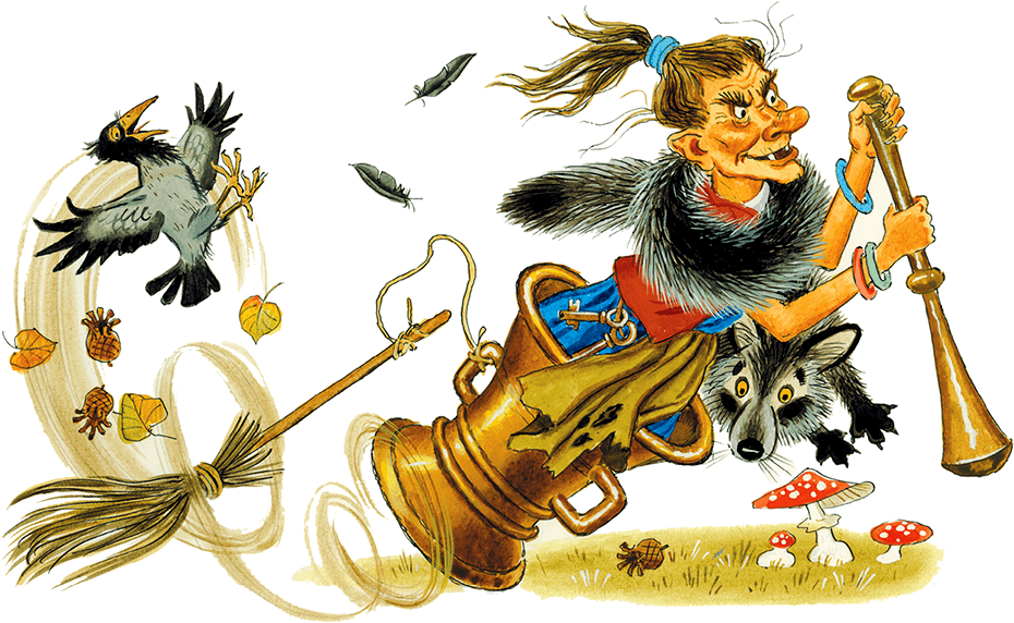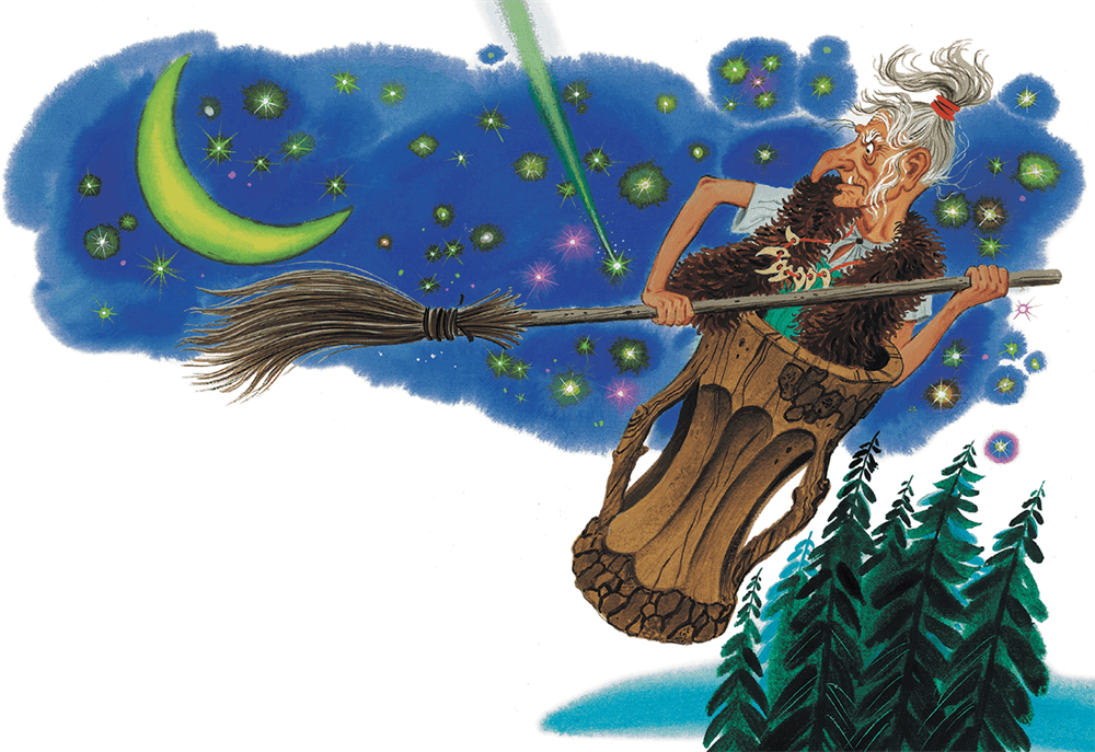 Наденет тогда старуха свою шубку, сядет в ступку, засучит мехом наверх рукава – да и была такова! Летит по воздуху, в ступке болтается, а за ней помело мотается.