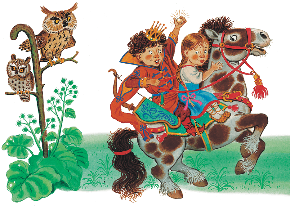 Потом три раза он свистнул, и прискакал его конь борзый. Взял он на руки Белочку и увёз во дворец.