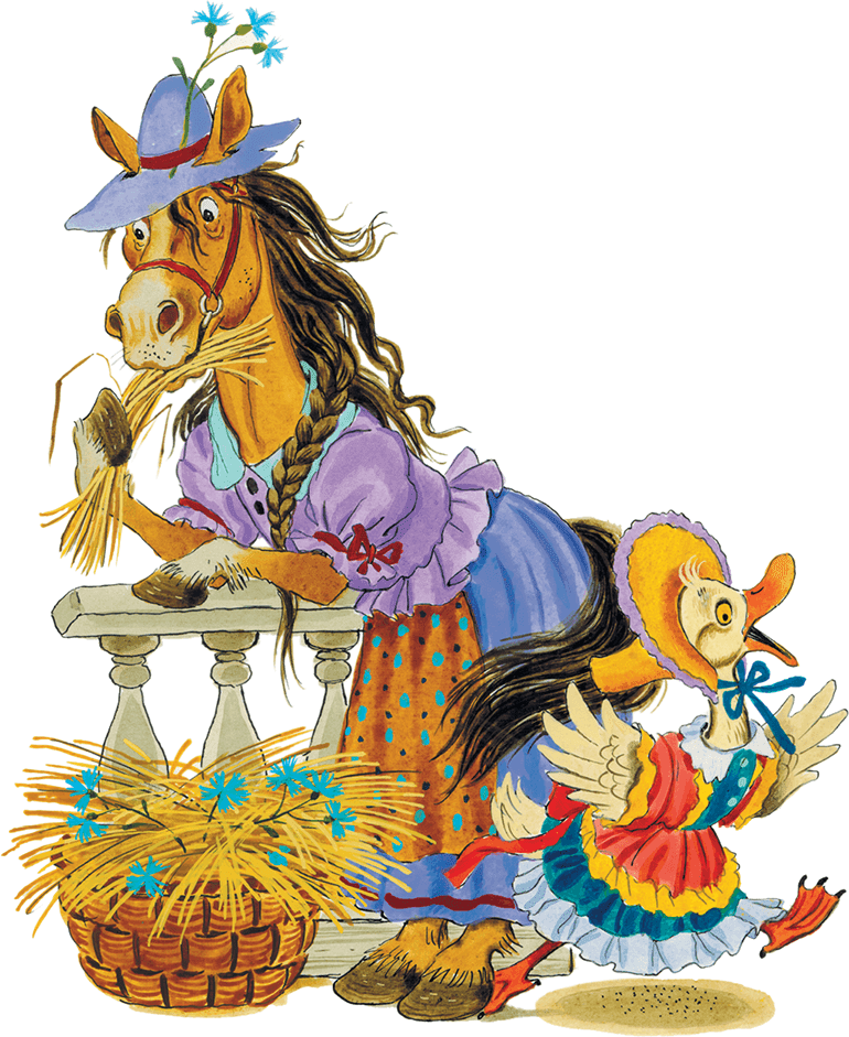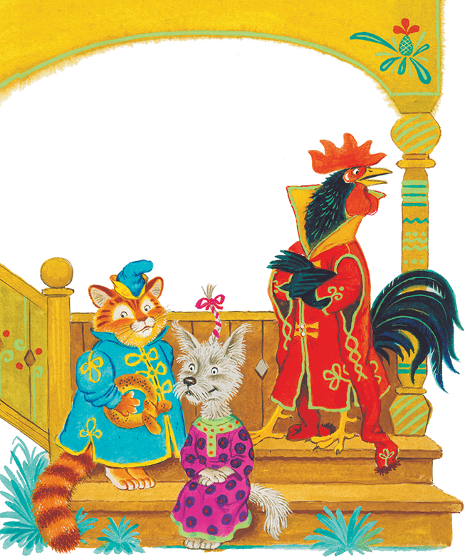 А кот Воркот, собака Шавка, курочка Чернавка и петушок Красный Гребешок живут во дворце и беды не знают.