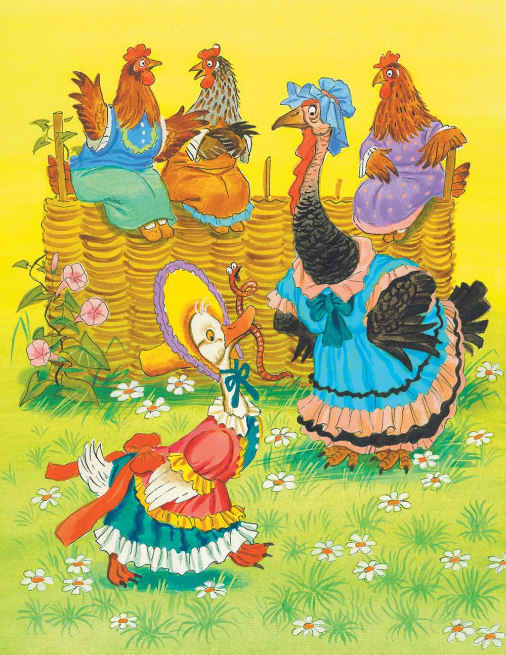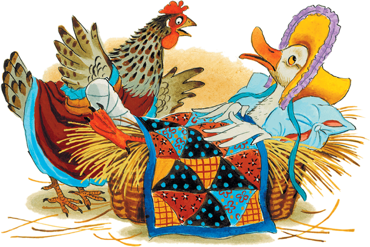 А курочка Чернавка живёт на даровых хлебах: поклюёт-поклюёт, да и заснёт. Проснётся – опять за корм возьмётся. И выдумывает она себе всякие потехи: то в лес пойдёт по ягоды и по орехи, а то просто по двору гуляет, птичье царство наблюдает. Подойдёт к уткам, клюнет их по головам и скажет: