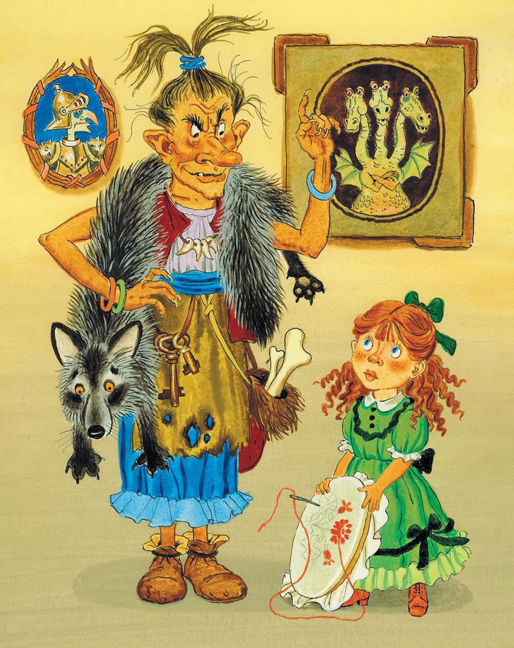 Жила-была на свете старуха. И была она высокая да тощая, а нос у неё крючком – ну точь-в-точь, как жердь с сучком. А на лбу-то у старухи бородавка, и растут на ней три волоса, словно в поле три колоса, по ветру качаются, друг с дружкой встречаются. А промеж старухиных губ торчит преогромный зуб.