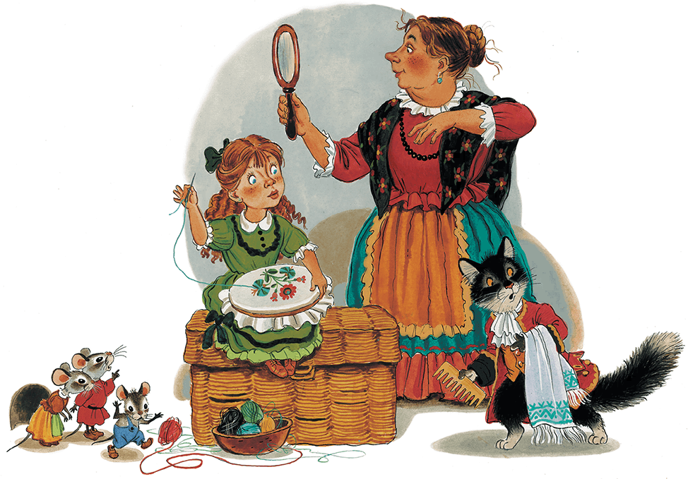 И жили с той старухой девочка Белочка, кот Воркот, собака Шавка, курочка Чернавка и петушок Красный Гребешок. Кот гостей сзывал, петух песни на дворе распевал, собака дом сторожила, курочка в дом ходила и на полу сорила, а девочка её бранила и пол подметала, чтобы старуха copy не видала.