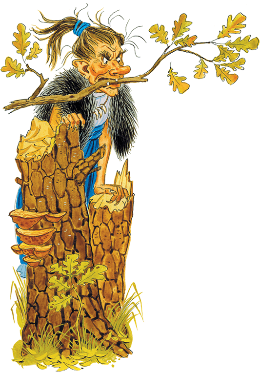 Прискакала Яга к лесу и – ни туда ни сюда. Никак ей через лес не продраться. Бросила Яга ступу, бросила толкач, подбежала к лесу, стала зубами деревья грызть. Грызла-грызла – и десяти дубов не повалила. Только даром зубы сточила. И воротилась Яга назад.