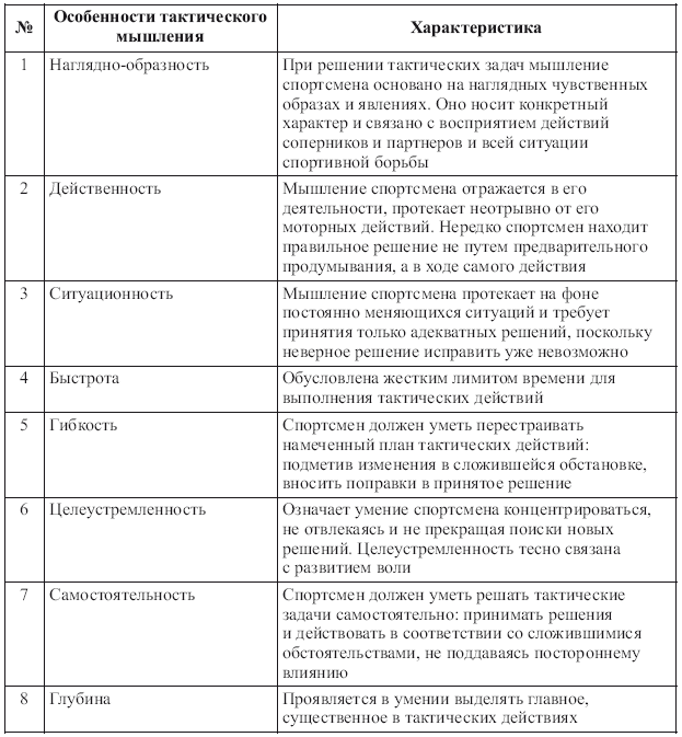 Проследить взаимосвязь особенностей тактического мышления спортсмена и соответствующих им характеристик можно на примере материала, представленного в таблице 2.2 [93].