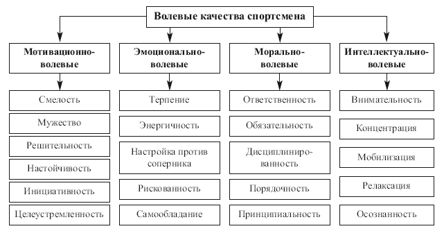 Всестороннее изучение проблемы волевой подготовки в системе психологического обеспечения спортсменов показало, что для представителей всех видов спорта необходимыми волевыми качествами являются: смелость, настойчивость, вера в себя, целеустремлённость, решительность, ответственность, дисциплинированность, терпение, самообладание, саморегуляция и др. [492].