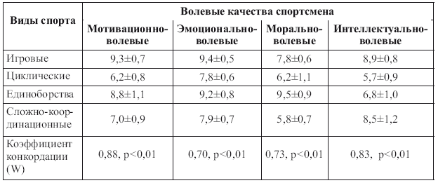 Для оценки степени влияния волевых качеств на представителей разных видов спорта мы выяснили мнение экспертов по данному вопросу. Оценка производилась по десятибалльной системе (табл. 2.3).