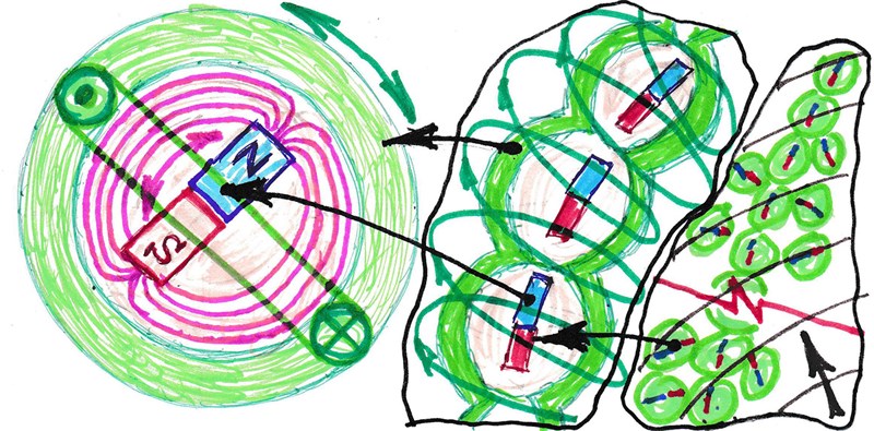 Мы уже понимаем, если система силовых линий замкнутая, например, в атоме, то в ней течёт постоянный ток, как постоянная череда событий. Если же разомкнутая, то потечёт переменный ток и разорванные силовые линии начнут сильно излучать. Тогда возникают процессы появления волн инфракрасного диапазона, тут же «откликнутся» соседние видовые элементы и силовые линии будут замыкаться. То есть, силовые линии притягивают электромагнитные волны, распространяемые родственными источниками. Замыкание концов (восстановление разрывов) прекращает излучение, а диполи извне будут перекачивать испускаемую энергию для своих нужд. Значит, сочетание замкнутых и разомкнутых силовых линий образует структуру колебательного контура. Как развивающуюся, двойственную систему, где замкнутые линии образуют магнитный диполь, а разомкнутые – электрический (диполь), который способен излучать и принимать информацию в виде энергии извне (построение формы).