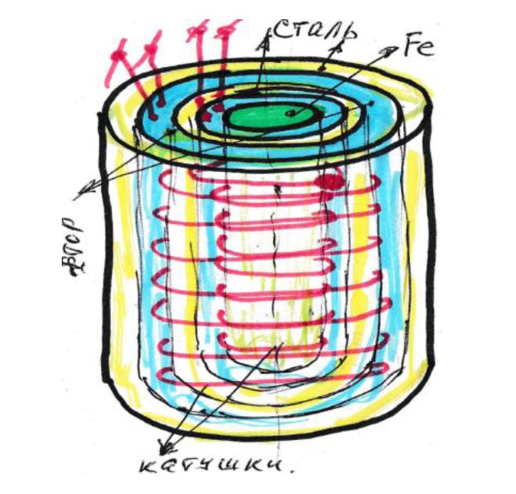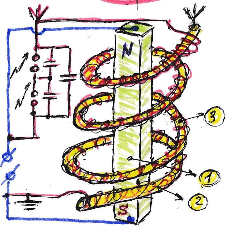 Рис. 18. Генератор электроэнергии. 1 – Стержень из цинка или 2 – магнит неодимовый, 3 – проволока из мягкого железа