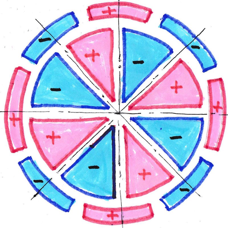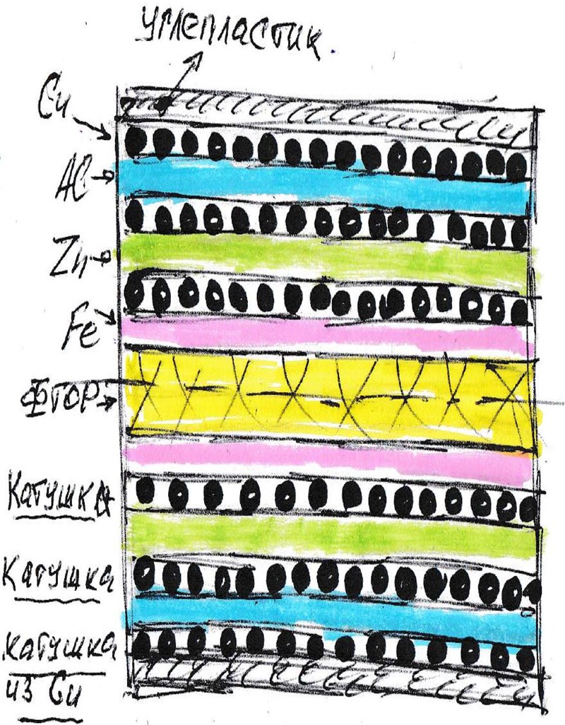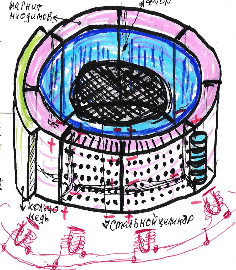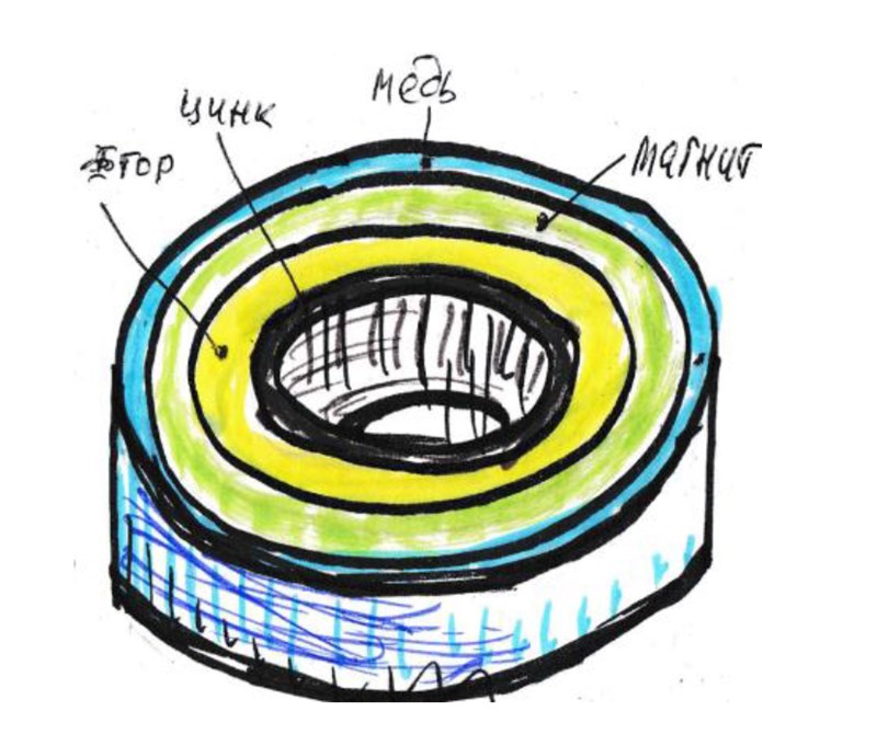 Итак, посмотрим на проблему используя опробованные решения, например, в левитирующих дисках Дж. Сёрла. Начнём с ротора, в качестве которого выберем 8 сборных цилиндров, каждый из которых должен быть выполнен как, например, на Рис. 25 из изолированных друг от друга круглых неодимовых магнитов в количестве 8 шт. Статор представляет собой сборный диск. В центре диска размещается сплошной цилиндр из железа, на него напрессовано кольцо из фторопласта, которое со всех сторон обрамляет собранное из 8-ми изолированных друг от друга секторов кольцо из неодимового магнита, которое снаружи стянуто кольцом из меди (см. Рис. 25). Сектора магнитного кольца статора, после распила на 8 сегментов, повернуть на 180 градусов и в каждом просверлить сквозные радиальные отверстия диаметром 2–3 мм на всю толщину в максимально возможном количестве. По кругу устройства расположить соединённые параллельно «магнитные хранители» (см. Рис. 25) в количестве 8 шт. для съёма нагрузки и подключения стартового аккумулятора. Сверловка отверстий в статоре позволяет плотнее прижать (уплотнить) силовые линии магнитного поля статора к его поверхности. Сборка статора должна обеспечить образование в каждом сегменте перпендикулярных друг другу дисковых вихревых потоков зарядов, сопровождающихся формированием выворачивающегося тора в статоре. При этом сверху диска генерируются отрицательные заряды, а снизу – положительные с образованием градиента плотностей. По центру поверхности на периферии статора возникает переменное по напряжённости от сегмента к сегменту кольцевое магнитное поле, которое начинает вращаться при движении цилиндров ротора, которые зависают в магнитном поле. Зависание происходит по причине того, что одинаковые по знаку заряды на сопрягаемых поверхностях роликов и статора отталкивают их друг от друга ровно на величину компенсации воздействия взаимного притяжения разноимённых зарядов на торцах роликов и кольца статора. Возникает эффект сверхпроводимости. При принудительной подвижке любого ролика взаимное отталкивание кольцевых магнитных полей их одноимённых зарядов на поверхностях, выстраивает их всегда на одинаковом расстоянии друг от друга, одновременно притягиваясь магнитными полями на торцах цилиндров к статору. При переходе от одного изолированного сегмента беговой поверхности на периферии окружности статора к другому, каждый ролик преодолевает различные зоны плотностей зарядов на поверхностях каждого из сегментов. Поэтому каждый из 8 цилиндров начинает вращаться с ускорением подгоняя друг друга при переходе от одного сегмента статора к другому. Что-то вроде американских горок, «тяни – толкай». Замкнутая синусоидальная магнитная волна вокруг статора начинает двигаться сразу же, как только сместится хоть один цилиндр ротора на один сектор статора. И все цилиндры ротора начинает «нести» в «магнитной реке» статора по окружности. А мы знаем, что кольцевое магнитное поле образует электрический ток, который легко можно снимать, используя хранители энергии, расставленные по периферии. Вверху устройства появляется устойчивая имплозия, далее проходят уже понятные нам и описанные ранее процессы.