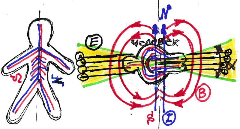4. Симметрия и равновесиеКаким образом биополе человека связано с энергетическими вихрями внешних полей? Например, солнечное сплетение – есть совокупность (спираль) нервных волокон, которые сконцентрированы в брюшной полости вокруг артерий основного центрального протока крови человека. Кровь содержит железо. Кровоток при работе сердца образуется в замкнутых артериальном и венозном контурах, создаёт токи, магнитные поля, аккумулирует, потребляет, забирает и перекачивает энергию извне для автономного жизнеобеспечения и обмена информацией. Обеспечение связи с окружающим миром производится электромагнитными полями через структуру воды, которая способна входить в резонанс, накапливать и транслировать информацию через вихревые и волновые образования элементарных частиц материи среды окружения. Оба кровотока являются стволовыми и тоже, вплоть до капилляров, окутаны нервными волокнами или системой длинных отростков нейронов, по которым распространяются импульсы. При том, по каждому волокну, различному по строению и функционалу, изолированно. При рождении, например, животного, ещё в утробе, начинает работать сердце. Оно перекачивает кровь, образуя слабый электрический ток. В итоге в нервных волокнах одновременно появляется магнитное поле. Оба контура, артериальный и венозный, как вдох и выдох, подчинены принципам вихревых электромагнитных взаимодействий на основе градиента зарядов. Организм дышит, как и всё в природе, подчиняясь законам движения.