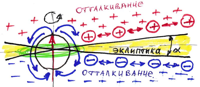 Следовательно, форма живого существа или его оболочка – есть граница (поверхность) отражения вибраций колебательных контуров симбиоза всех жизненно важных его внутренних органов (их вибросистем), с образованием стоячих волн интерферирующих полей внутри этой формы, с внешней средой. Где выстраиваются причудливые, присущие только этой форме, множественные пространственные сети различных взаимодействующих между собой структур материи, которые и являются энергетической основой данного живого существа, благодаря градиентам бесчисленных зарядов (см. Рис. 26). Значит, форма (оболочка) является резонатором электромагнитного взаимодействия различных источников излучений. При этом, образование зеркальности любых живых организмов связано с их дипольной структурой от микро до макрообъектов. Любой организм во Вселенной формируется из вихревых образований материи на принципах электричества и магнетизма, а значит является диполем во внешних интерферирующих магнитных полях других диполей (других объектов) среды окружения (см. Рис 27). Даже вблизи друг друга влияние соседа существенно. То есть, в вихревых дипольных образованиях объектов материи формируется своеобразная α-зона плоскостей «влияния эклиптики», пересекая которые объекты с меньшим зарядом диполей в своей пространственной сети, изменяют свои позиции переворотом или переключением собственных структурных полюсов. И это происходит каждый раз при пересечении верхней или нижней плоскостей границ эклиптики зоны влияния более сильного внешнего диполя взаимодействия более слабым (см. Рис. 28) – эффект Джанибекова В. А.