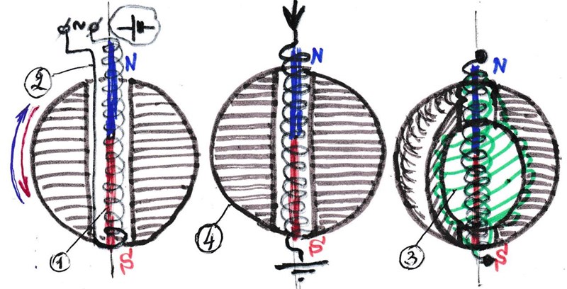 Для определения механизмов управления энергией магнитных и электрических полей, предлагается опробовать варианты изготовления схем сборки со сферическими и стержневыми магнитами с планетарными навивками соленоидов (см. Рис. 40). Где поз. 1 – стержневой постоянный магнит, поз.2 – различной конструкции соленоиды медной проволоки при планетарной навивке, поз. 3 – тороидальный соленоид в теле сферы постоянного магнита, поз. 4 – постоянный магнит в виде сферы. Также любопытно испытать версию с добавлением витков вторичных катушек в 1 и 2 схемах для испытания в режиме трансформатора, а в 3 схеме – в режиме генератора. Появление изменений будет происходить с некой задержкой во времени. Целесообразно каждое действие проводить с соответствующим позиционированием относительно меридианов и параллелей Земли.