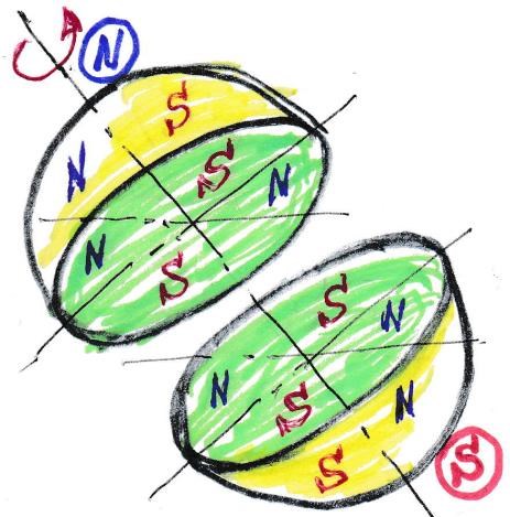 Спиральные вихри (как линии магнитного поля) диполей вдоль оси между полюсами ничто иное, как аналог насоса для перекачки энергии от центра экватора к полюсам, когда диполь нейтрален. Когда диполь становится заряженным («+» или «-»), то граница Блоха смещается, изменяя направление движения зарядов (градиент). И тогда энергия магнитного поля в такой спирали то разжимается, то сжимается, формируя электромагнитные поля. И там, где вращение таких взаимодействующих вихрей совпадает, то скорость совместного потока увеличивается, а давление падает, притягивает материю окружения. И, наоборот, где вращения противоположны – создаётся торможение и рост давления, как интенсивности магнитного поля, тогда образуется диполь. В отличии от постоянных магнитов, которые просто создают вокруг себя вращение среды. Значит, магнитные поля двух диполей расталкивают друг друга всё интенсивнее (с ростом электричества), разрывая при этом собственные силовые линии взаимодействующих диполей, запоминая события и одновременно испуская импульсы электрической энергии для восстановления их целостности. По сути, эти процессы и есть своего рода «датчики» (сигналы) о произошедших событиях в окружении извне.