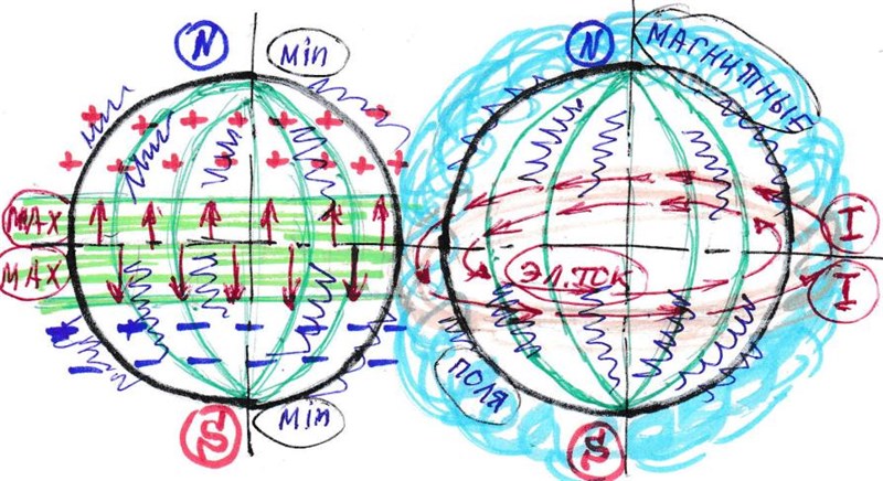 Представим, что полусферы планет (систем) становятся не просто диполями, а диодными образованиями на их поверхности, естественно на разных высотах геосферы (см. Рис. 42). Если на плоскости экватора сосредоточено вращающееся электрическое поле, то вдоль меридианов располагается магнитное поле, как в обычном диполе. Становится реальной возможность чередования изменений полюсов (располюсовки) во взаимно перпендикулярных плоскостях электрических и магнитных полей под влиянием внешних воздействий во время вращения объекта вокруг своей оси и по орбите. Создаётся вращающееся, бегущее, волновое магнитное поле по поверхности сферы, которое поддерживает вращение объекта (планеты).