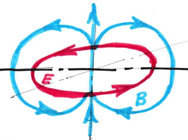 Внутри любых вихрей всегда течёт ток. В замкнутом контуре – постоянный со своим индивидуальным «шумом», а по разомкнутому контуру течёт ток переменный, как источник излучения. Обычно, замкнутый контур (вихря) – это магнитный диполь, а разомкнутый – электрический диполь. А «шум» – это как признак работы источников излучений. Мы знаем, что круговой электрический ток всегда вызывает осевой магнитный момент, то есть, ось магнитного поля является осью вращения его тока (см. Рис. 48).
