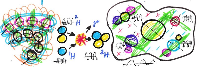 И это верно, потому, что наличие определённой частоты колебаний – есть единый стандарт измерения, приемлемый для всех форм материи. А способность излучать и принимать – есть универсальный инструмент созидания разных форм материи в точном зеркальном исполнении информационных полей внешней среды (как в их отражении). Каждая такая форма не что иное, как электрическая резонансная система (информационное содержание), способная обрабатывать информацию из электромагнитного поля своей среды обитания. В которой существует электропроводная плазма или «газ» в виде электронов и ионов, вещество которого из свободного состояния может переходить в структурные формы излучений (диполи), как менее плотные. И под воздействием магнитных полей превращать плазму поэтапно в состояние газа, потом жидкости и потом твёрдого тела. Так в едином магнитном поле пространства космоса образуются элементарные частицы, из которых формируется нейтрон. А молекула дейтерия – это оригинальная структура с памятью нейтрона, который управляет ресурсами энергии водорода, его взаимодействием с излучениями, например, в планетах, которые далее перейдут в фазу звезды из-за радиоактивных процессов распада её внешних слоёв. Вероятно, подобным образом и зарождаются новые элементы вещества. Например, элементарный вихрь при сложении двух когерентных колебаний втягивает (увлекает) в свою среду (зону влияния) энергию (вещество) извне окружения. В результате синхронизации вибраций в магнитном поле среды выделяется плазма, как внутренняя энергия от распада захваченного объёма вещества, и формируется тот или иной ритм уже нового колебательного процесса в виде новой элементарной частицы.