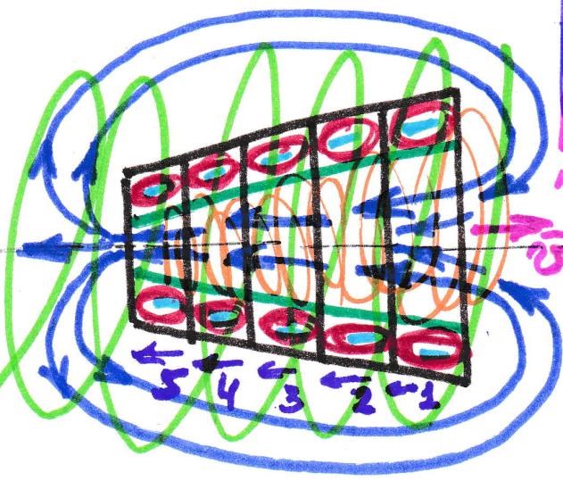 В таком случае, попробуем использовать эту систему общения материи, например, для транспортирования лекарства в микромире организма человека, или перемещения космического корабля в макромире нашей галактики. Разве не заманчиво создать тороидальный электромагнитный вихревой двигатель, который не требует в штатном режиме работы какого-либо запаса топлива вообще? Потому, что конструкция отталкивается от внешнего пространства, взаимодействуя с ним через явления магнетизма и электричества.Управляется аппарат изменением направления и ослаблением потока импульсов электромагнитного поля. Процесс запускается от бортовой электроустановки и, при достижении явлений резонансного отклика источников извне, переходит в режим открытой вихревой системы, и отключается от питания. Энергия начинает поступать из электромагнитных полей пространства окружения. Образуется искусственный вихрь электромагнитного поля, который стабилизируется магнитным полем множества отдельных кольцевых катушек, расположенных вдоль общей оси в виде усечённого полого конуса. «Оператор» управляет образовавшимся в среде окружения потоком плазмы через конструкцию единого тора, генерируя в нём явления резонансного всплеска частот вихрей между множеством его единичных торов и внешним электромагнитным полем. В данной конструкции одиночные вихри структурных торов работают как разгонные блоки, ускоряя поток, который в итоге создаёт общий тороидальный вихрь тяги двигателя (см. Рис. 58). В этом устройстве все навивки катушек должны быть «планетарными» на кольцевых магнитных сердечниках. Для различных задач замедления движения, управления или остановки летательного аппарата с применением этого «изделия» используются эффекты смены полюсов вихрей и вращения «дисков» крайних торов вокруг оси конструкции. То есть двигатель является «вихрепроводом», через который разгоняются уплотнённые заряды внешней среды, которые предварительно, до образования вихря, позиционируются когерентно в зоне влияния электромагнитного поля установки под действием магнитного поля катушек торов. И, увлекаемые вдоль линий индукции тора, перемещают конструкцию взад или вперёд, в зависимости от направления его поля, когда поток образовавшейся плазмы среды направлен внутрь или наружу конуса корпуса двигателя.
