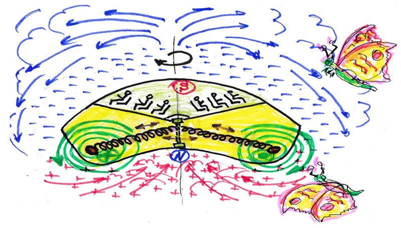 В данном случае, благодаря центробежным воздействиям зарядов в атмосфере, над платформой зарождаются отрицательно ионизированные потоки энергии (патогенной для живых клеток) увеличения и расширения. Тут частицы среды переходят в неустойчивое состояние с повышенной частотой структурных вихрей, которые при малейшем увеличении зарядов извне, способны к моментальному объёмному расширению. В данном случае внешний корпус служит устройством для уравновешивания деформаций среды от воздействия на неё через реакцию противодействия материала корпуса, а не от «гравитации» извне. Тогда под платформой возникают явления уменьшения и конденсации охлаждённой атмосферы в результате влияний сформировавшихся центростремительных потоков зарядов вихрей, циркулирующих перпендикулярно силовым линиям уже единого диполя устройства. Радиальные знакопеременные движения зарядов различной природы в совокупности с вращением неизбежно образуют вокруг установки электромагнитные поля вихрей в форме тора.