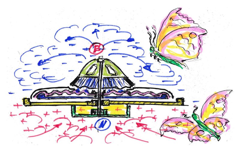 Главное в работоспособности таких систем – это одновременно возникающие явления чередования холода и тепла, расширения и конденсации среды, центростремительных и центробежных воздействий или полей отрицательных и положительных зарядов. Во всём этом просматривается образование устойчивых незатухающих колебательных систем с потреблением энергии извне, из плотной среды окружения пространства. В результате чего, явления расширения и увеличения температуры холодной среды над установкой, чередующиеся с процессами конденсации и уменьшения температуры окружения под платформой (как дыхание на полупериоде колебаний), образуют напряжённость в пространстве или градиент плотностей зарядов, который поднимает объект вверх усилием возникшей устойчивой имплозии, позволяя устройству левитировать. Такой процесс очень напоминает взлёт бабочки, где взмахи крыльев и есть чередование циклов сжатия и разряжения в едином ритме полёта. Этот эффект тем сильнее, чем выше влажность среды окружения. Вода в данном случае играет роль не только катализатора процессов ионизации частиц среды, но и их источника при концентрации зарядов.