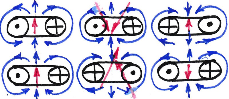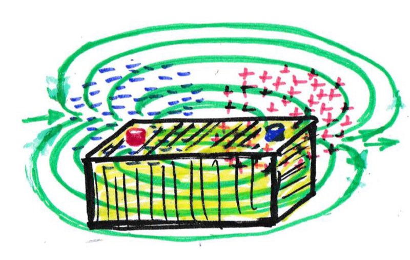 В таком случае, почему же батарея не прекращает работать? Очевидно, потому, что энергия берётся не из батареи, а из окружающей среды. Иными словами, батарея только лишь формирует диполь, который превращает локальную среду ограниченного пространства вокруг него в напряжённое, нестабильное состояние. Состояние, которое начинает изливать энергию во все стороны, и часть этой энергии из окружающей среды захватывает наша батарея.