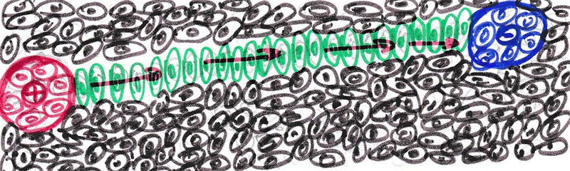 Рис. 10. Энергетический тоннель между зарядами в хаосе «нулевых» вихрей среды
