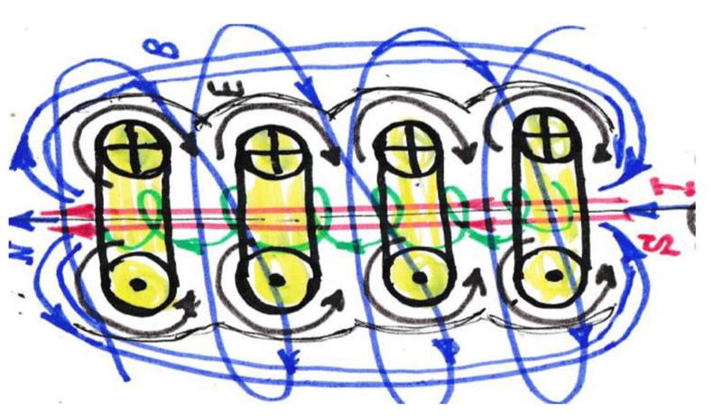 Все знают, что переменное электромагнитное поле – это последовательность взаимных мгновенных превращений в пространстве магнитных и электрических полей, возбуждённых с помощью колеблющихся зарядов. При таком возмущении, или образовании разности потенциалов в среде, происходит локальная переориентация направления диполей «нулевых» вихрей пространства (и иных диполей) с формированием силовых линий магнитного и электрического полей в сторону векторов передачи энергии. То есть «нулевые» и иные вихри в узлах гравитационных сетей пространства разворачиваются таким образом, что образуются множественные подобия «тоннелей» из соединённых вдоль своих осей торов (см. Рис. 10). Количество таких проводников может быть бесконечно много до тех пор, пока не уравняются поля энергии внешних оболочек вихрей взаимодействующих возбуждённых зарядов. Внутри вихревого тора всегда присутствует разрежение, поэтому присоединение или отталкивание вдоль оси вихрей зависят только от направлений вращения, «+» или «-» (см. Рис. 11). При их совпадении силовые линии (выворачивания) каждого тора на внешней поверхности «тоннелей» сливаются в единую волновую поверхность силового поля, образуя общий спиральный вихрь в виде плотной энергетической оболочки. Скорость движения тока возникающих зарядов внутри таких защищённых проводников резко возрастает. Одновременно в каждом диполе увеличивается скорость вращения дисков вихрей тора, и под внешним воздействием среды окружения, они сжимаются всё сильнее и сильнее (см. Рис. 12).