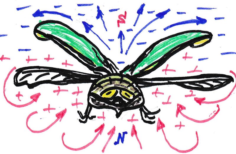 Объёмные хитиновые тельца, надкрылья, да и сами крылья многих насекомых, образованы различными сочетаниями мельчайших геометрических «Платоновых фигур», которые объединены в самые причудливые формы, по аналогии с сотами. Эта тема хорошо прописана в работах Гребенникова В. С. Предположим, что такие однородные полостные структуры (см. Рис. 1) способны не только многократно отражать и приумножать проникающие в них звуковые волны, но и создавать условия для их синхронизации и эффекта резонанса в единой системе той или иной формы тела жука, например, надкрыльев, брюшка, грудки и головы. В результате, неизбежны генерации более мощных импульсов энергии звука. То есть в данной системе звук многократно усиливает свои колебания во всех мельчайших полых ячейках различных форм насекомого, которые взаимодействуют между собой как единый колебательный контур в унисон. И природа потрудилась найти оптимальную геометрию резонаторов под определённую частоту вибраций, издаваемых каждым отдельным видом насекомого. Подобные ячеистые структуры возбуждают и многократно усиливают не только собственные звуковые колебания, издаваемые прозрачными крылышками жуков, но и воздействуют на любую тонкую материю в окружающей их атмосфере, такую как элементарные частицы, атомы, молекулы вещества и т. д. Эти частицы мгновенно реагируют на воздействие разрушением собственных электромагнитных и слабых связей, приумножая тем самым количество различных зарядов не только внутри хитиновых пластинок, но и вокруг насекомого. Одновременно, со взмахами прозрачных крылышек в среде ниже надкрыльев и тельца зарождаются вихри, которые образуют определённые зоны разности потенциалов, или границы градиента противоположных зарядов в пространстве (см. Рис. 2). Формируются области повышенного и пониженного давлений, расположение которых регулируется положением корпуса насекомого. Именно создание и управление такими векторными полями градиента зарядов в воздухе, позволяют тяжёлому и неуклюжему жуку при отсутствии аэродинамических форм не только летать, но и успешно маневрировать.
