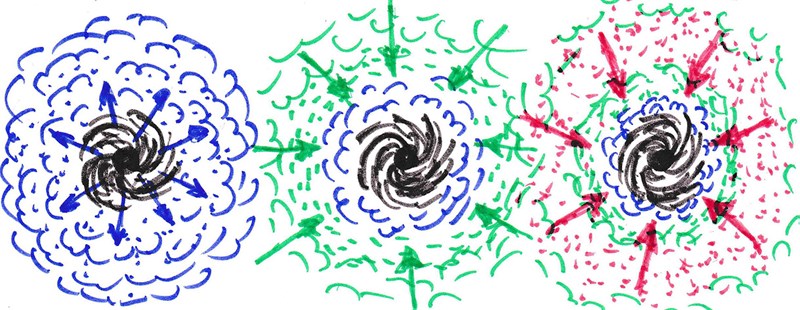 Рис. 3. Воздействие вихря на среду: центробежное, нейтральное, центростремительное