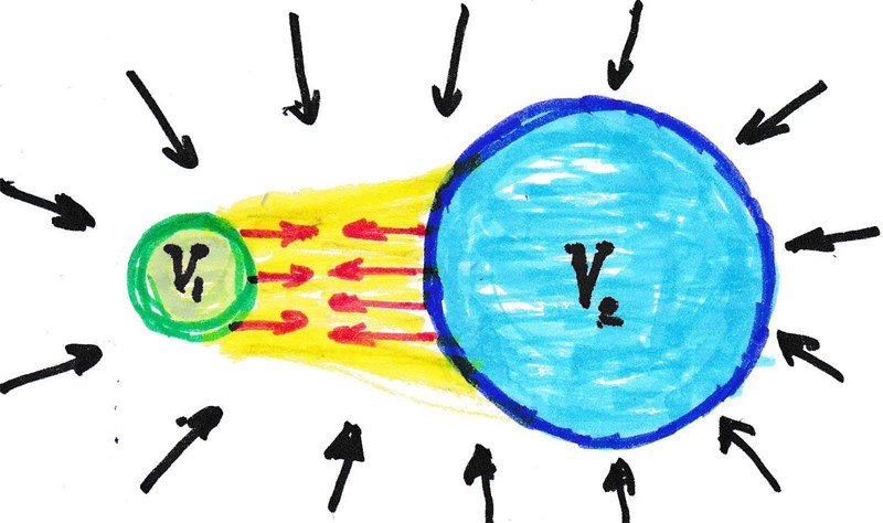Не будем сбрасывать со счетов теорию теней двух объектов в гравитации ЛеСажа при одинаковом давлении на них со всех сторон материи пространства, которое прямо пропорционально размерам их поверхностей. То есть всемирное тяготение тел рассматривалось как теория весов или плотность и степень их экранированности, как телесного угла отдаления объектов (См. Рис. 4). Своего рода интенсивность выталкивания среды окружения.