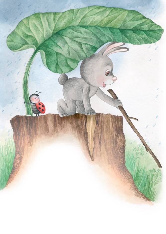 – Сюда, друг, на пенёк! – скомандовала находчивая Божья коровка. – Он высокий, там мы и спасёмся. И возьми на всякий случай палку и эти два листа лопуха, чтобы укрыться от капель.