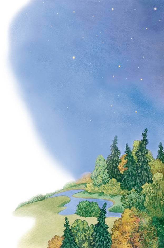 Сова внимательно посмотрела на капельку, потом подняла свои огромные глаза и увидела высоко на дереве, среди листвы, маленькое зеркальце, припрятанное Сорокой. Оно отражало свет звёзд и направляло их отблеск как раз на маленькую капельку сквозь дырочку в листе лопуха.