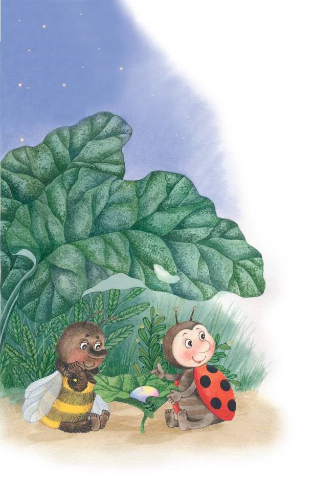 Капелька всё дрожала и сверкала. Вечером Пчёлка-соседка возвращалась в свой домик и снова увидела Божью коровку с ее драгоценной капелькой.
