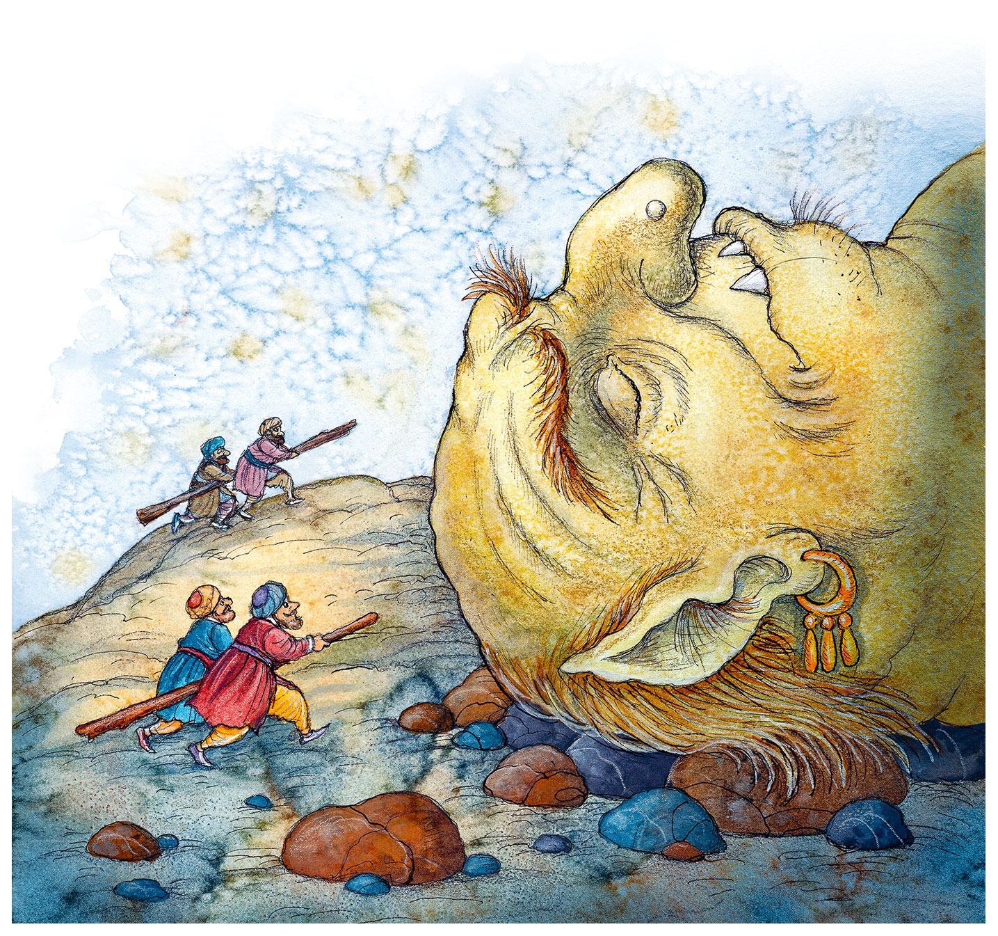 Спутники Синдбада тоже проснулись и лежали на земле полумёртвые от страха. Великан подошёл и нагнулся над ними. Он долго рассматривал каждого из них и, выбрав одного, поднял его, как пёрышко. Это был капитан Бузург – самый большой и толстый из спутников Синдбада.