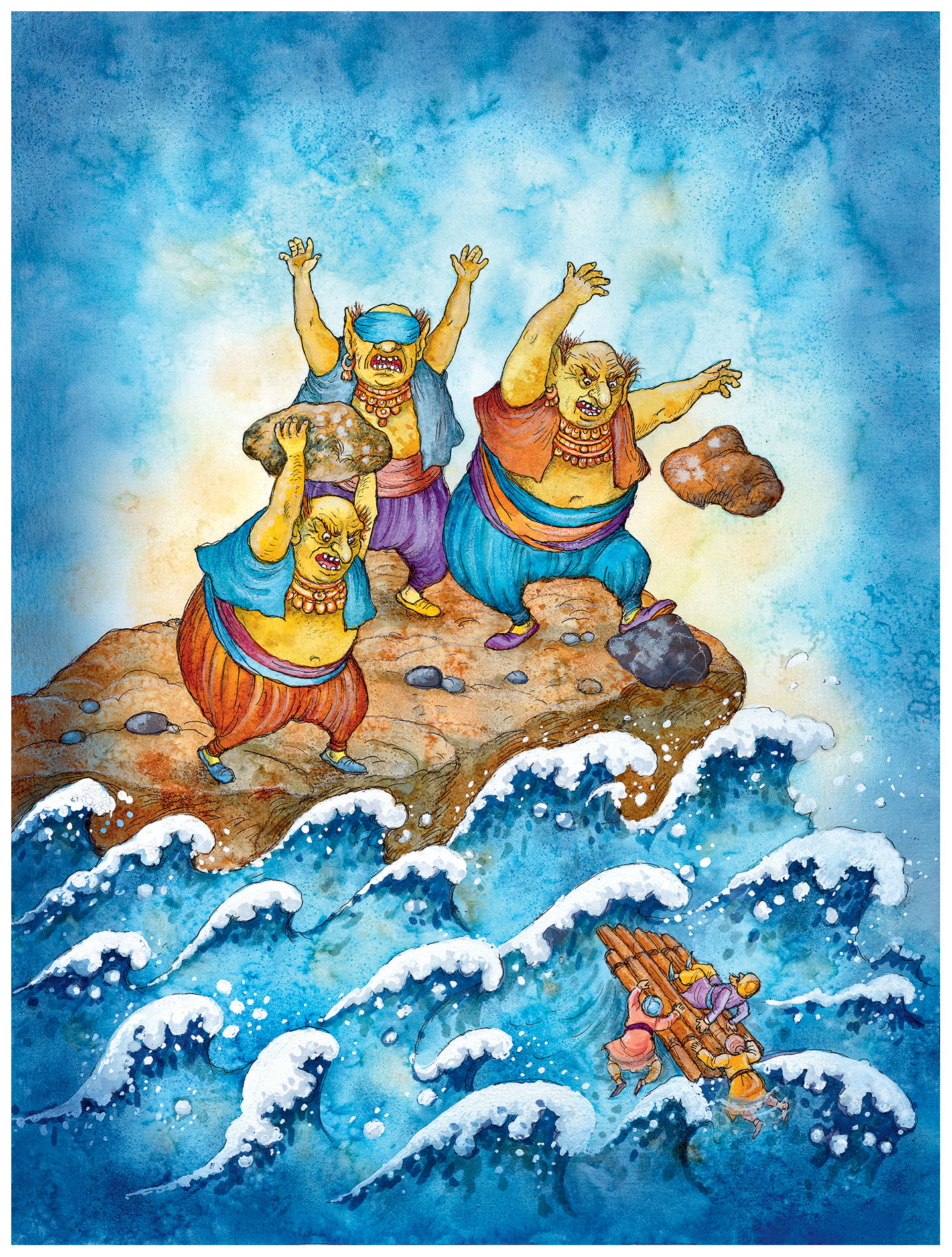 Когда людоед услышал удары весла о воду, он понял, что добыча ушла от него. Он закричал ещё громче прежнего. На его крик прибежали ещё два великана, такие же страшные, как он. Они отломили от скал по огромному камню и бросили вслед беглецам. Глыбы скал со страшным шумом упали в воду, только слегка задев плот. Но от них поднялись такие волны, что плот перевернулся. Спутники Синдбада почти совсем не умели плавать. Они сразу захлебнулись и пошли ко дну. Только сам Синдбад и ещё двое купцов помоложе успели схватиться за плот и удержались на поверхности моря.