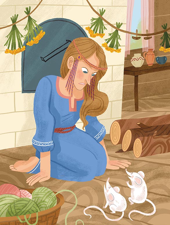 Отец простился и поехал домой. А Баба-яга задала девушке пряжи с короб, печку истопить, всего припасти, а сама ушла. Вот девушка хлопочет у печи, а сама горько плачет. Выбежали мышки и говорят ей: «Девица, девица, что ты плачешь? Дай кашки; мы тебе добренько скажем». Она дала им кашки. «А вот, – говорят, – ты на всякое веретёнце по ниточке напряди». Пришла Баба-яга: «Ну что, – говорит, – всё ли ты припасла?» А у девушки всё готово. «Ну, теперь поди – вымой меня в бане». Похвалила яга девушку и надавала ей разной сряды[2]2
