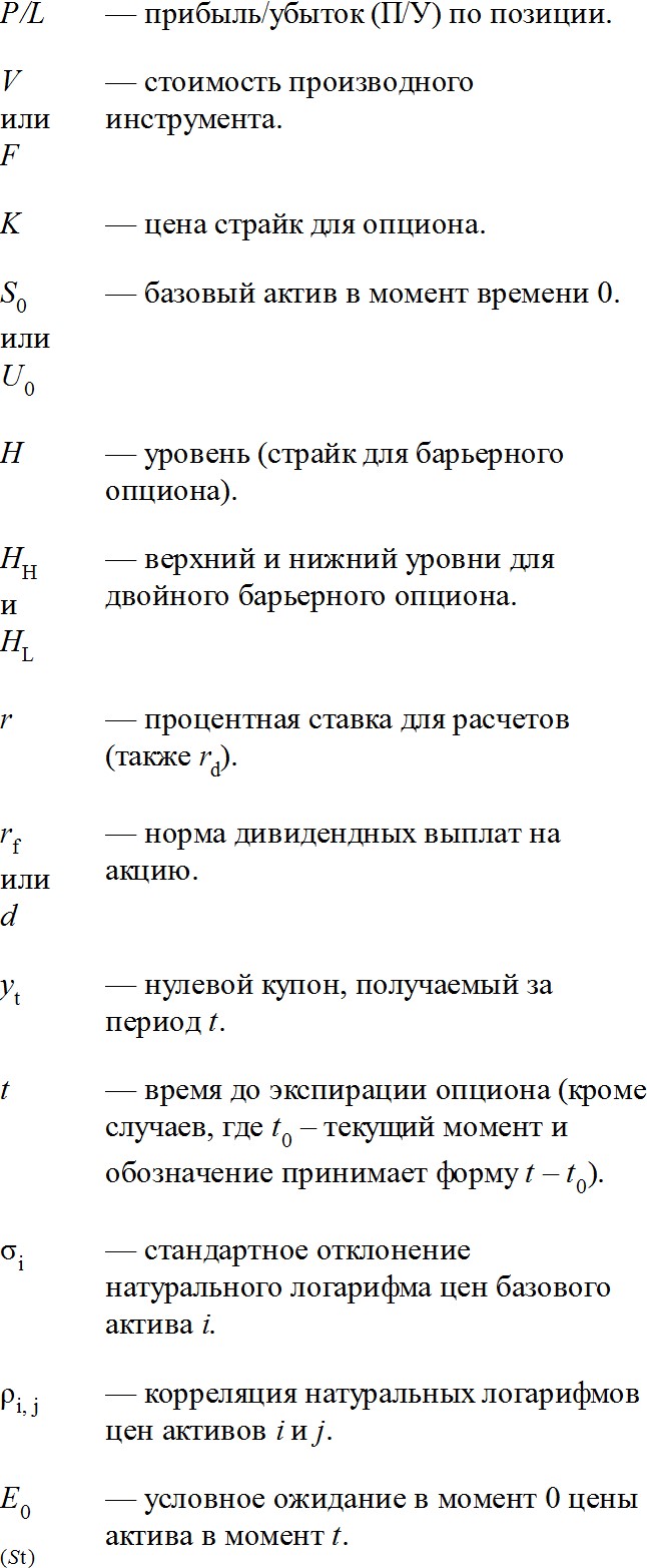 [Закрыть]. В расчетах форвардная цена считается равной цене спот, а финансовые издержки незначительны для нашей цели (кроме редких случаев, где они имеют значение). Все опционы считаются опционами европейского стиля за исключением экзотических, где стиль может быть изменен, если это считается важным.