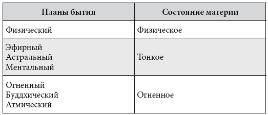 Во всем Мироздании существует семь основных планов бытия. Это физический, эфирный, астральный, ментальный, Огненный, Буддхический и Атмический планы. Каждый план образован своим, одноименным видом материи.