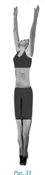 Чтобы поднять вертикальные потоки выше головы, вы должны захватить энергию Земли (коснуться открытыми ладонями энергии Земли), направить ее в небо, как бы отдавая ему взятую энергию, при этом становясь на цыпочки как можно выше, и замереть на носочках на секунду-другую (рис. 31).