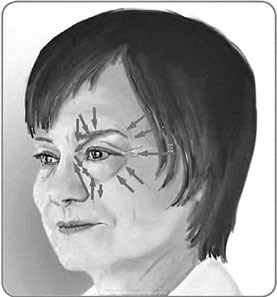 В общих чертах деформацию круговой мышцы глаза можно представить в виде сужения диафрагмы фотоаппарата, «лопасти» которой сворачиваются по верхнему веку почти всегда по направлению к внутреннему углу глаза (рис. 4.6). Ставшая в этом случае лишней кожа верхних век нависает, закладывается в складочки, а сам размер глаза значительно уменьшается.