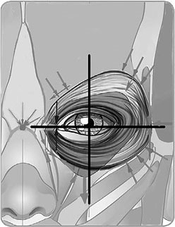 Обратите внимание, что глазница представляет собой условную окружность (рис. 4.7), поэтому орбитальная область является центром напряжения, сравнимым с водоворотом, в который затягиваются ткани круговой мышцы глаза (рис. 4.8).