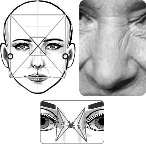 Область переносицы становится дополнительной зоной риска, в которой концентрируются несколько векторов деформаций. Назовем ее Розой ветров. Несмотря на романтичность названия, направления векторов этой структуры провоцируют возрастные изменения, превращая переносицу в настоящий гордиев узел проблем.