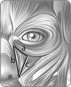 Данный дефект не был бы столь явно выраженным, если бы не усиливался спазмом других мышц, также вплетающихся в SMAS. Речь идет о гипертонусе следующих мышц: латеральной мышцы носа, мышцы, поднимающей верхнюю губу и крыло носа (грань b треугольника), и мышцы, поднимающей верхнюю губу (грань c треугольника).