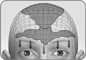 Также веностаз может проявляться в виде образования отечного «мыска» в верхней части лба, тянущего «ермолку» вниз из-за избытка жидкости, скопившейся под скальпом (рис. 4.26).