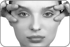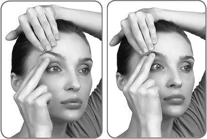 6. Одной рукой натяните бровь у виска. А пальчиками второй руки плотно прожмите подбровное пространство, как бы приклеивая ткани к мышце.