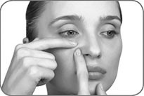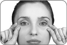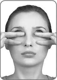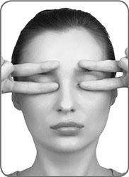2. Указательные пальцы слегка опустите вниз и немного сместите к внутреннему углу глаза. Зрачки под закрытыми веками направлены вниз. Задержите это положение на 30 секунд. Возвратите пальцы в исходное положение. Поднимите взгляд вверх. Зафиксируйте.