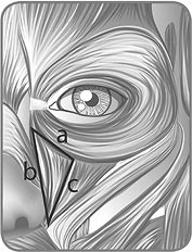 • по вектору деформации, идущему вдоль латеральной мышцы носа и мышцы, поднимающей верхнюю губу и крыло носа (грань b треугольника);