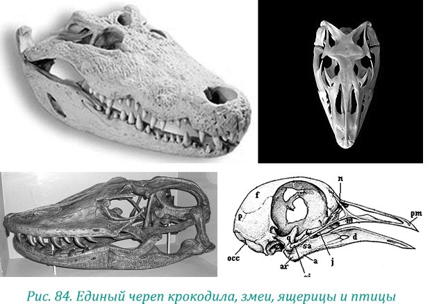 В этом нет ничего странного, поскольку с точки зрения палеонтологии динозавры – самые крупные позвоночные ящеры – передали строение своего черепа крокодилам, птицам, ящерицам и змеям – все они вышли из одной ветви (рис. 84).