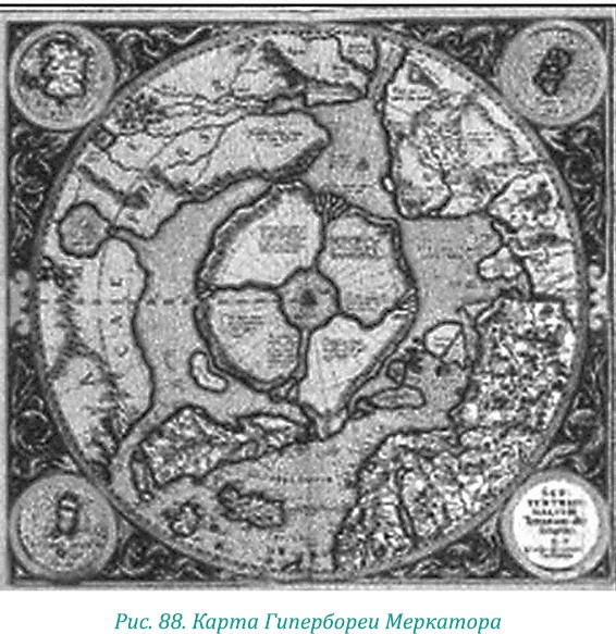 Существуют древние карты, на которых изображен исчезнувший полярный материк – Гиперборея. До нашего времени они дошли в копиях работ великого фламандского картографа Герарда Меркатора, самого известного картографа XVI века. Одна из его карт 1554 года воспроизводит очертания северных земель наиболее полно, без поправок на новые географические открытия (рис. 88).